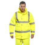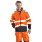 Water resistant. Windproof. Result 3 layer Softshell technology. Breathable. Soft stretch fabric. Comfortable active cut. Fashionable shaped longer back panel. Full front zip fastening. 2 zip closing side pockets, 1 zip closing chest pocket, large inside pockets and 1 inside phone pocket. Adjustable shockcord hem. Inner storm flap to neck and collar. Decorative front yoke. 50mm sewn in safety tapes incorporating 3M™Scotchlite™ reflective materials. Concealed access for Print and Embroidery. Waterproof and breathable fabric.